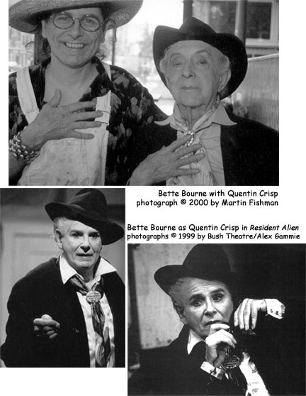 Resident Alien, a stage adaptation by Tim Fountain and Quentin Crisp of Mr. Crisp's writings, showcased Bette Bourne and played a limited run at the New York Theatre Workshop during January and February 2001. The show made it's world premiere in London in 2000.